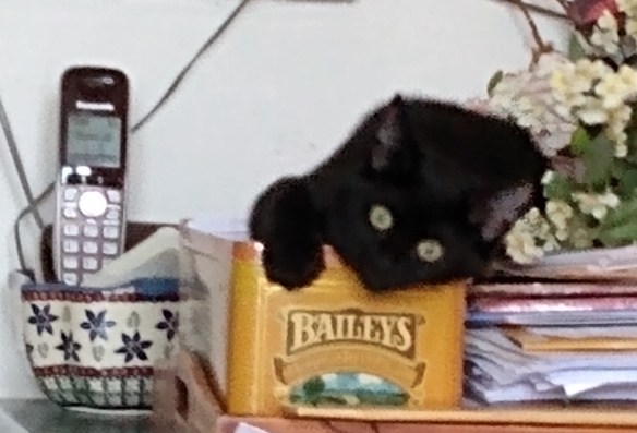 Miss G, G2, Gertrude is……OMG what a handful. She is so cute, but my word, there is not a second while she is awake that I do not have to be on the alert. She is into everything. Soon she will be big enough to reach things on the wall that are just tantalizations right now, and I’ve really already had to take some things down. Nothing is safe from her. I am trying hard to NOT be one of those ‘yell at the cat’ people, but sometimes, I just have to put her in the bathroom so I can have a break. She is exhausting, and for someone who already has a notable lack energy thanks to fibro/chronic fatigue, I don’t need more exhausting things in my life. But she really is so cute and cuddly, she’s hard to resist. Back to the vet Wednesday for her final shots and to discuss spaying. Supposed to be better for them, but I kind of hate to do it. Not only because how on earth will I manage her when she’s in a big collar? More fun ahead.