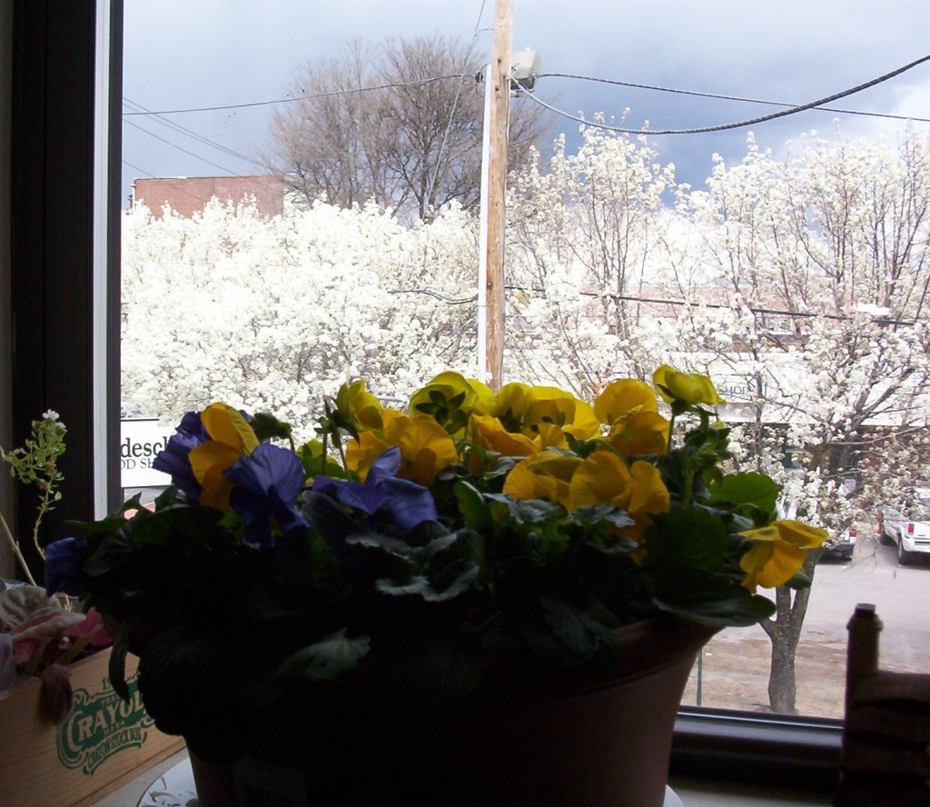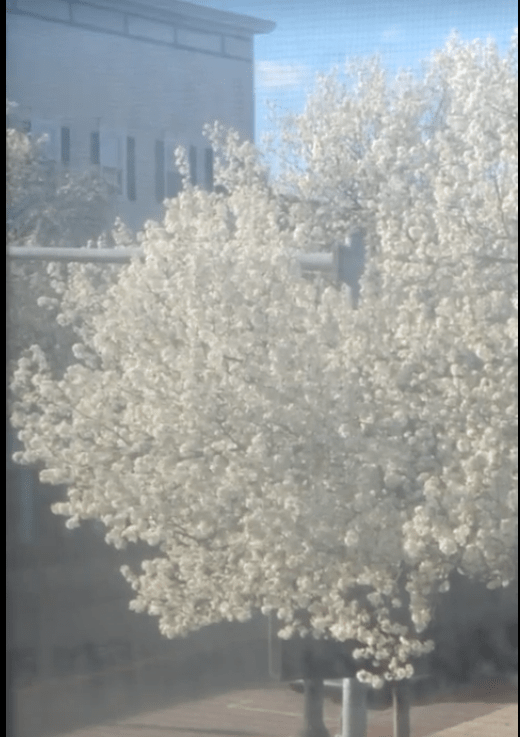 The trees across the street are all flowered up now, too. Very pretty, Gorgeous day out. So nice to be outside. Been some time since I was outside. Wish I had a porch, or a yard. Oh, well. But it was a very good day, so happy Jean is tired but happy. 🙂