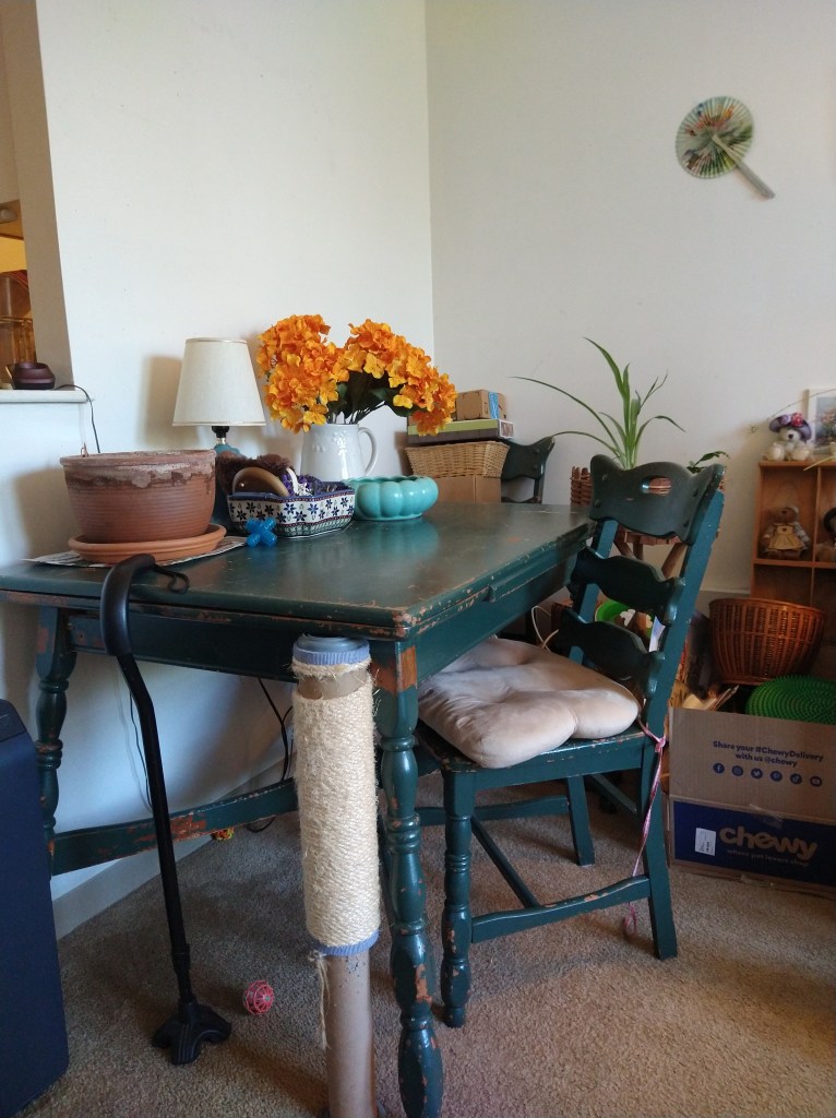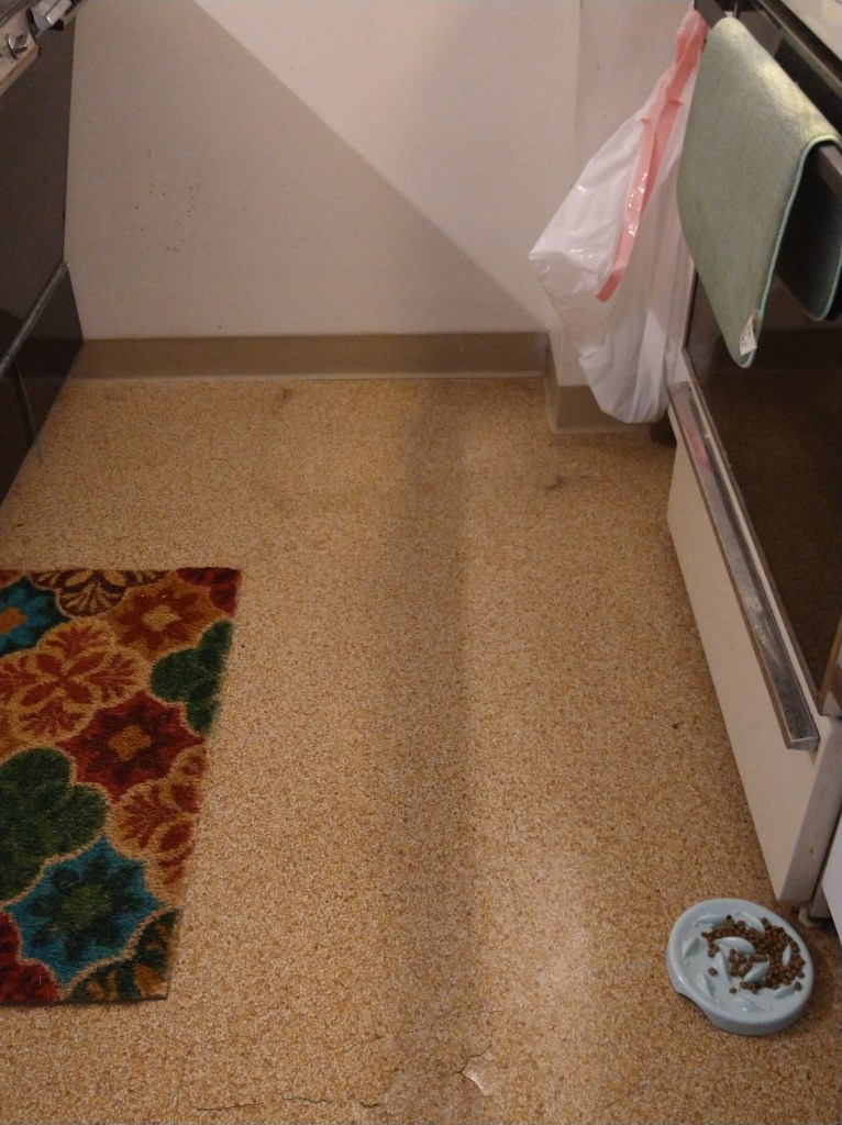 There was a cart there with the microwave and toaster oven and it was such a pain to move it everytime I needed to open the dishwasher. So gone. Finally. Still a work in progress which is why the stove is a mess.That’s the flower pot that is corroding or something. It’s going out. Way out. NOT a clean floor, but I just love the cat dish.