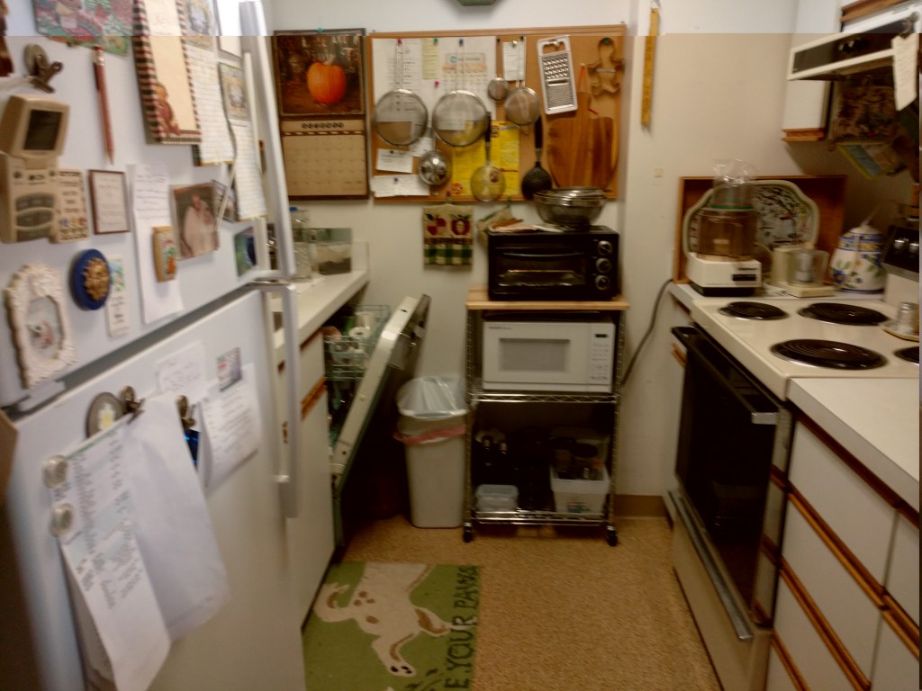 My kitchen before Second Gertrude, and well before me being so not really functional. Not much on the frig or the wall now, thank you Miss G.