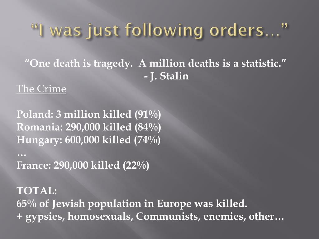 “Under international law, every person has the responsibility to refuse illegal or immoral orders, no matter who gives them.” This was established during the Nuremberg Trials after the second World War,